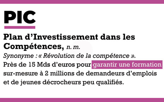 Le Plan d'investissement dans les compétences (PIC) souhaite miser sur les qualifications à acquérir afin de démontrer que tout n'est pas joué à la fin de la scolarité. A cette fin, le PIC vise à transformer le système de formation professionnelle pour soutenir la "compétitivité" des entreprises et des associations. L'intérêt de ce plan est de mettre en place une logique d'investissement sur